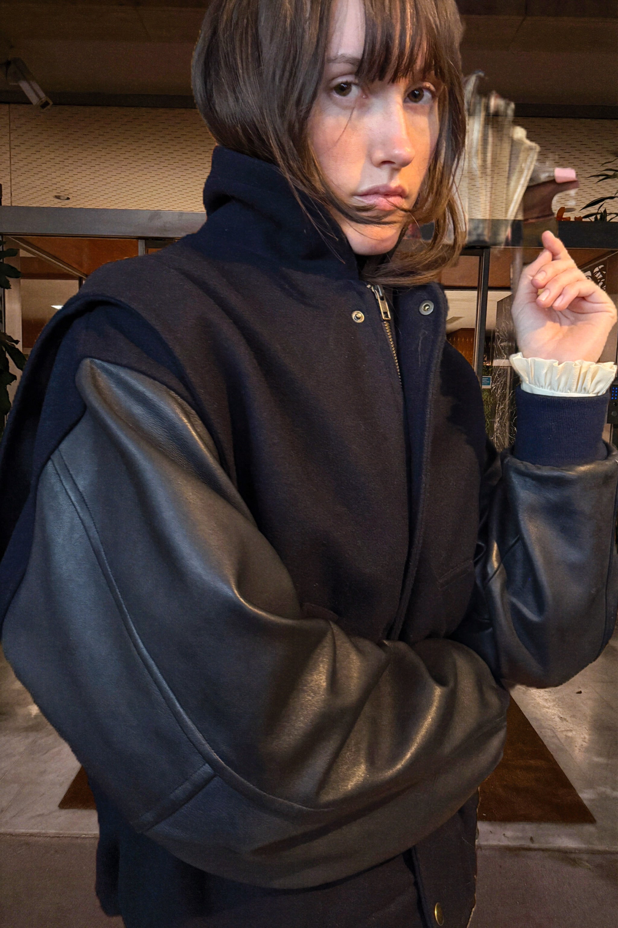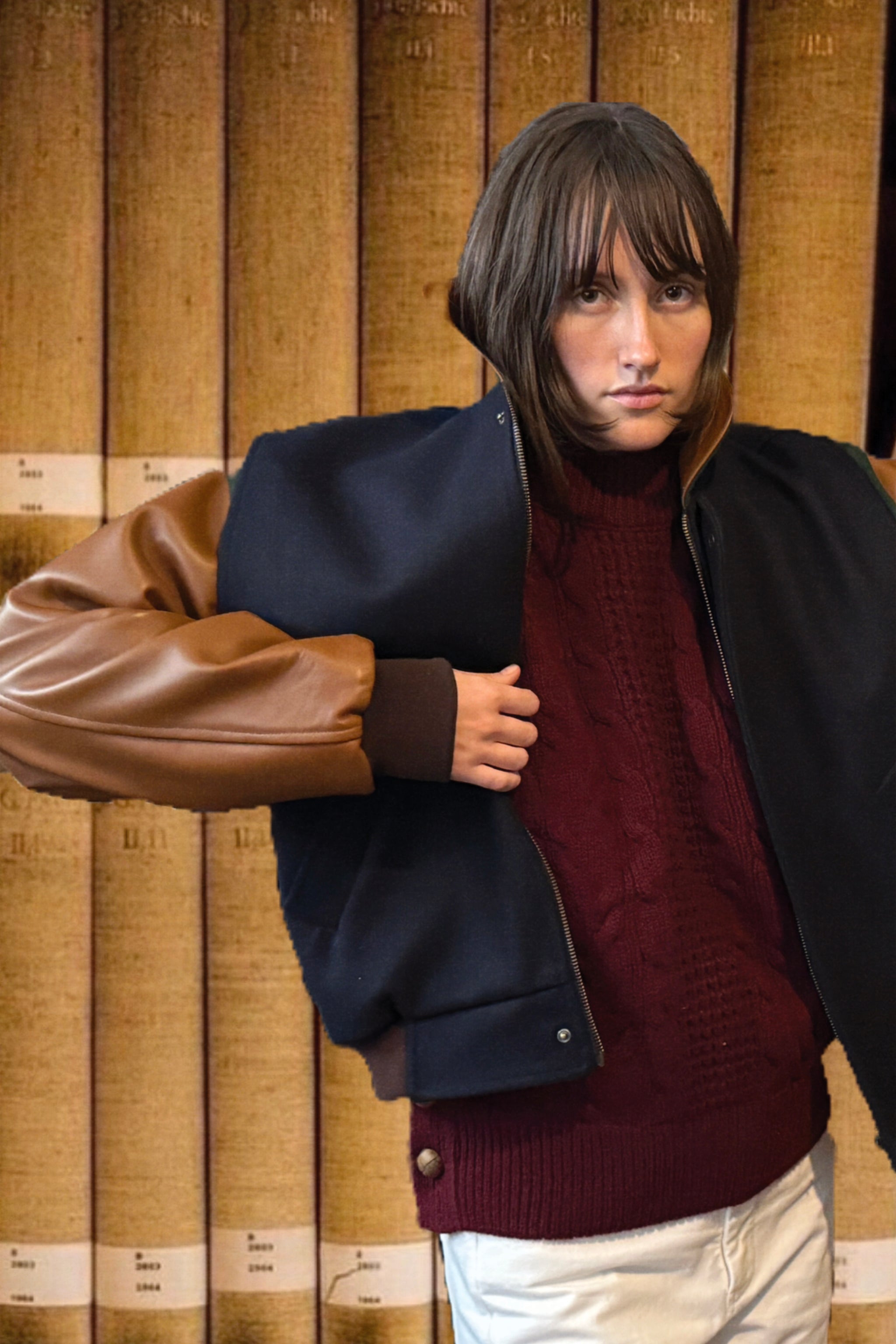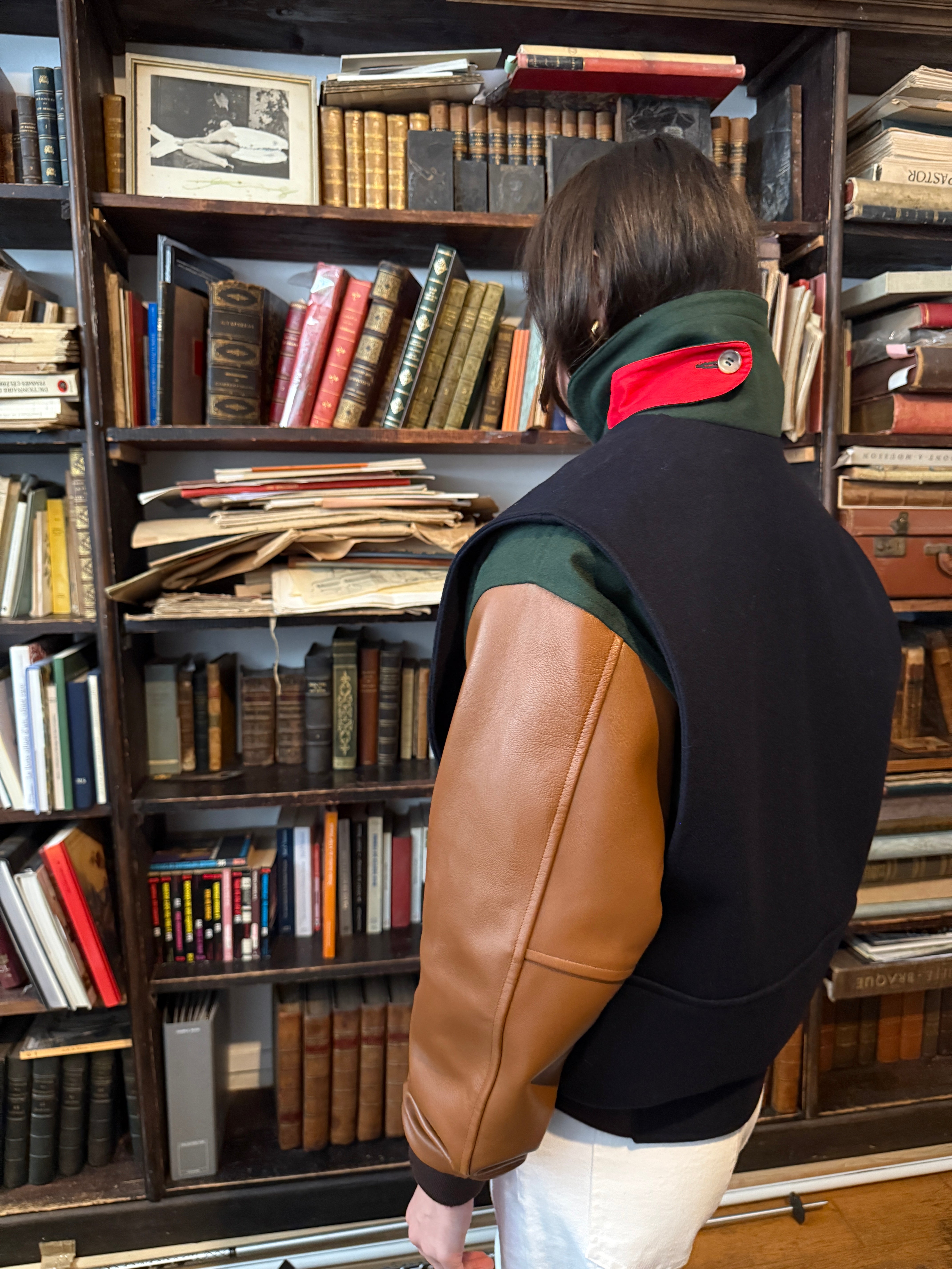 Le Blouson JUMP est un Teddy revisité par Les Prairies. Bi-matière en cuir et laine, soufflet aux emmanchures pour plus d'aisance, col montant, 2 poches raglan devant, fermeture éclair devant.