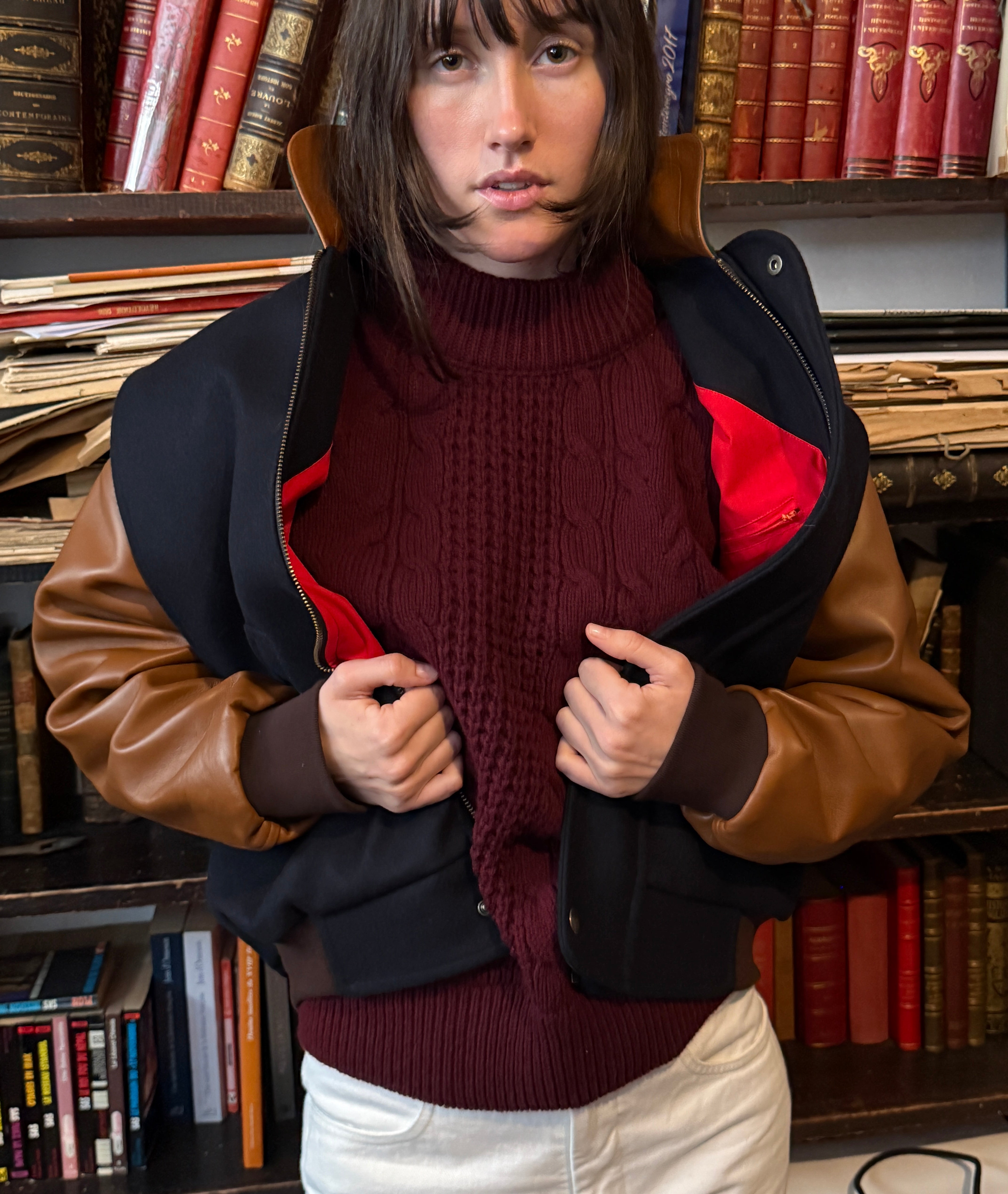 - Drap Marine Manches cuirs Caramel - 80% Laine, 20% Polyamide, Col et manches 100% Cuir d'agneau doublure intérieur coton rouge