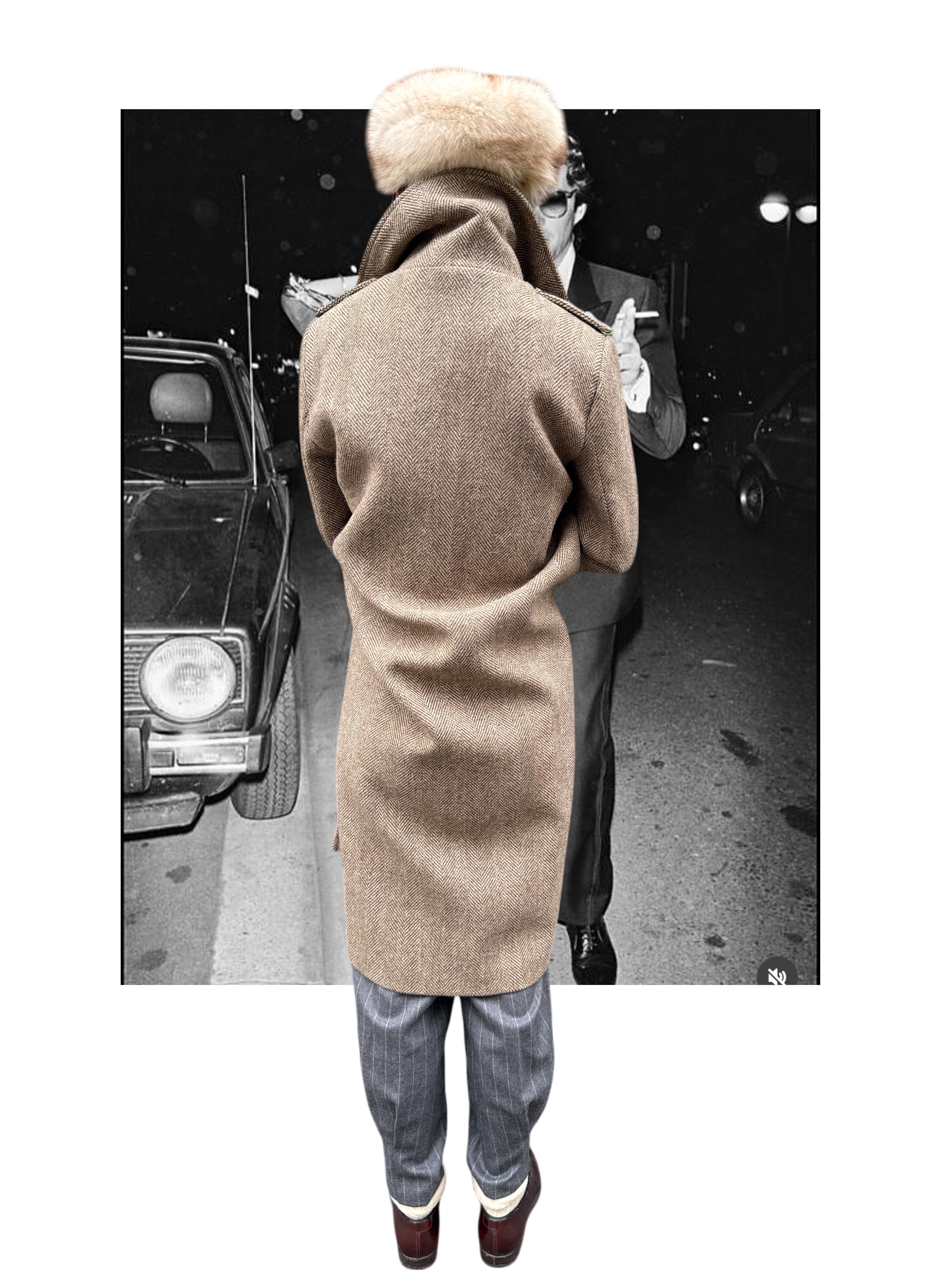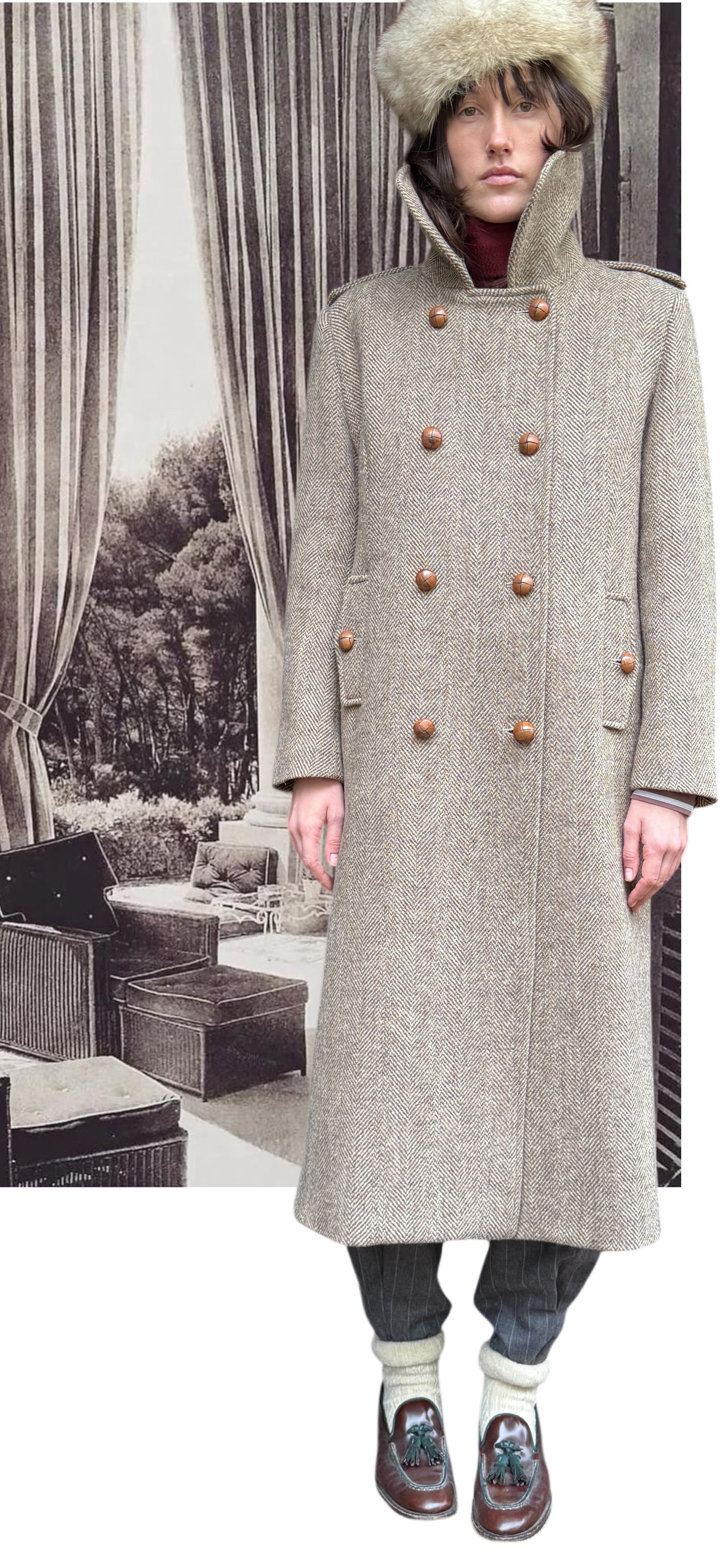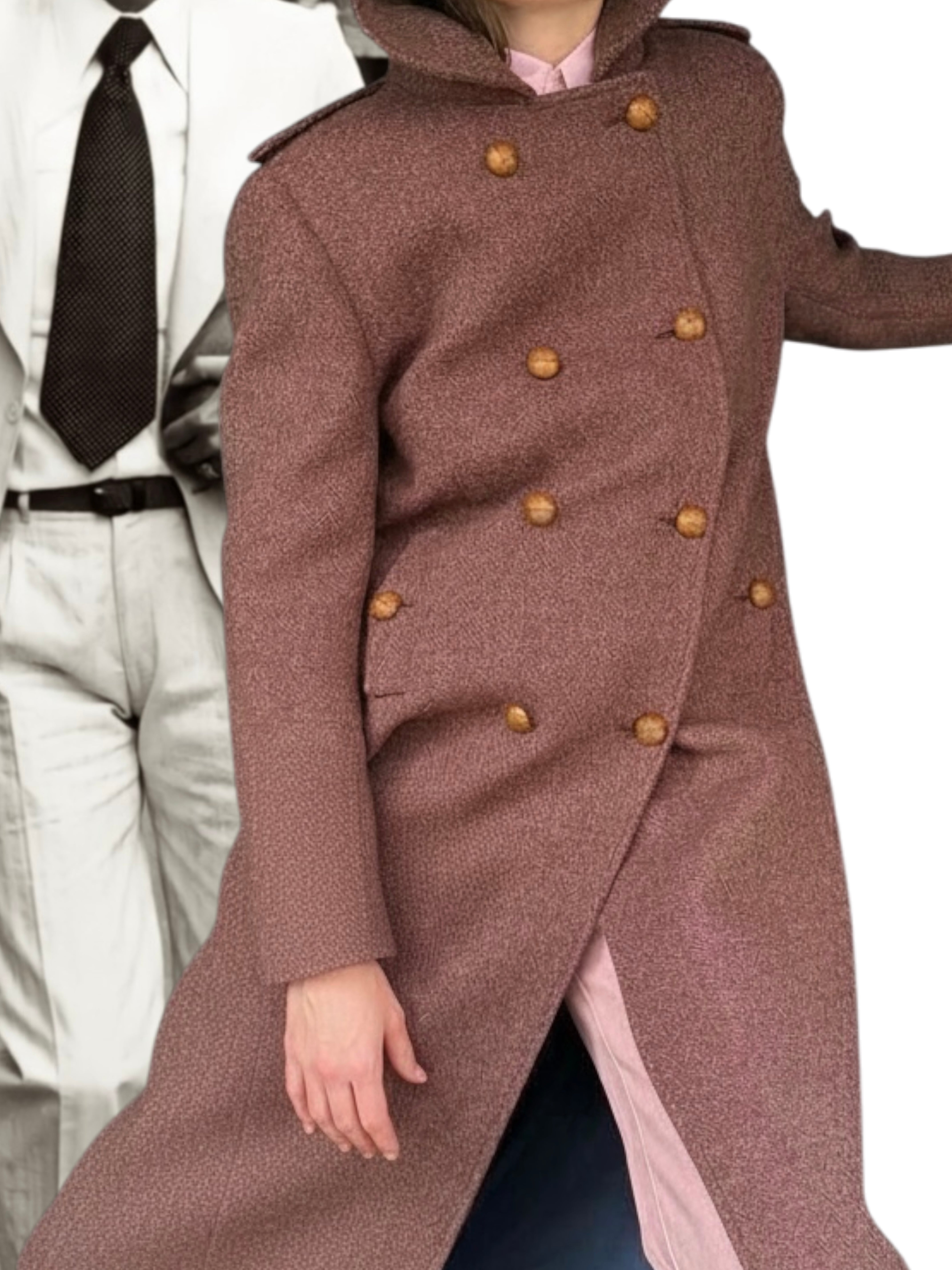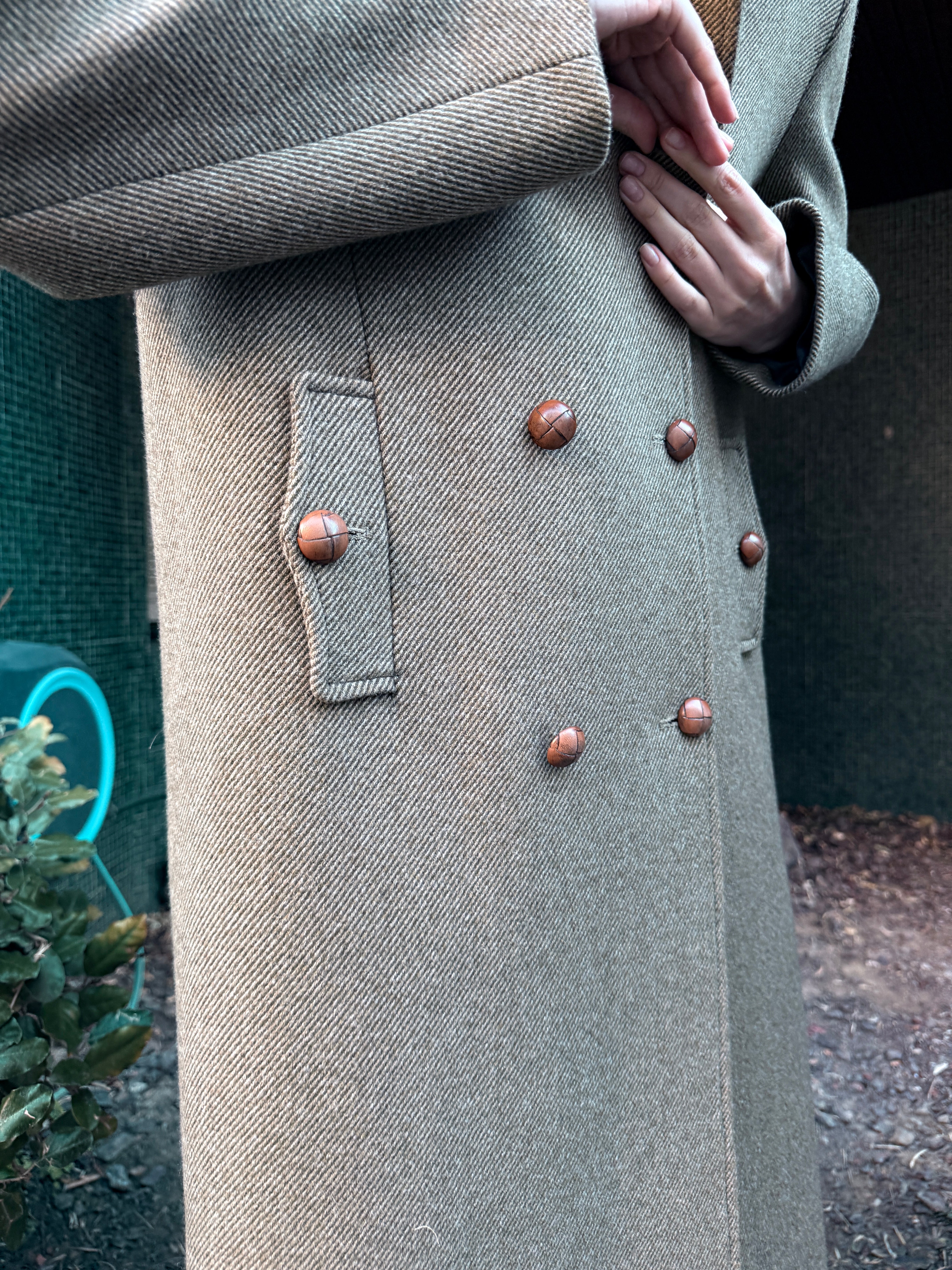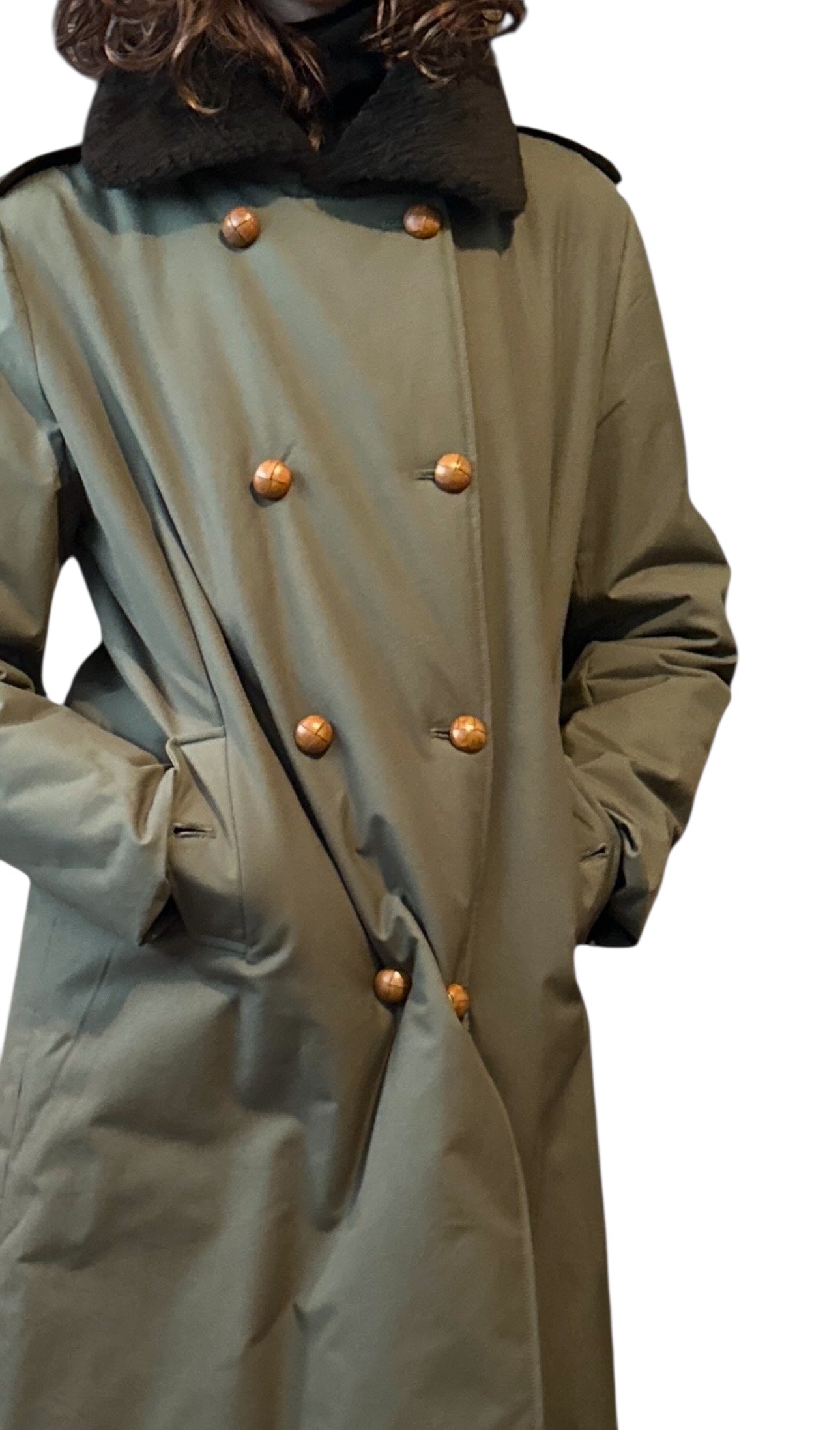 Manteau long aux influences militaires.  Coupe droite, longueur mi-mollet, grand col, 2 poches Raglan devant, fermeture double boutonnages, boutons en cuir caramel vieillis.